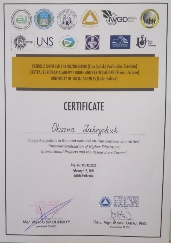 Ас. Загричук О.М. пройшла міжнародне стажування на тему Інтернаціоналізація закладів освіти: міжнародні проекти та партнерства(2021 р.)