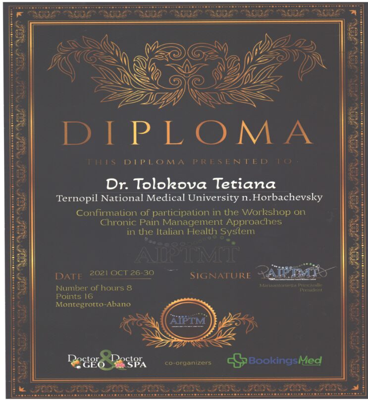 Доцент Толокова Т.І. приймала участь у науково-практичній конференції «Реабілітаційні та фізіотерапевтичні методи лікування у системі охорони здоров’я Італії» (м. Абано-Монтегротто, Італія, регіон Венето, 25.10-02.11.21).