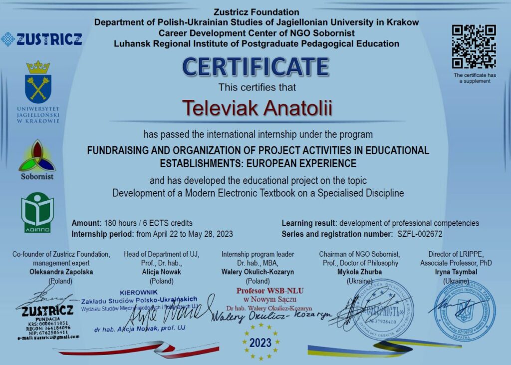 Доцент Телев’як А.Т. пройшов онлайн міжнародне стажування 22.04.-28.05.2023 р. в м. Кракові (Республіка Польща) на тему: «Організація проектної діяльності в освітніх закладах: європейський досвід.» (180 год)
