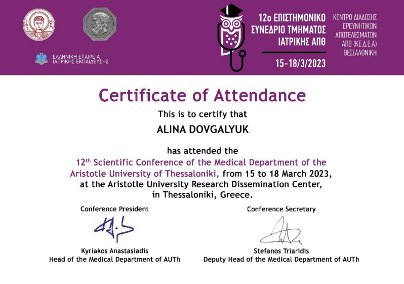 Сертифікат як підтвердження участі в конференції доц. Аліни Довгалюк (2023 рік)