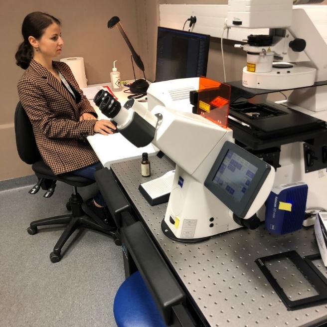 Доц. Соломія Крамар під час роботи за конфокальним мікроскопом (2024 рік)