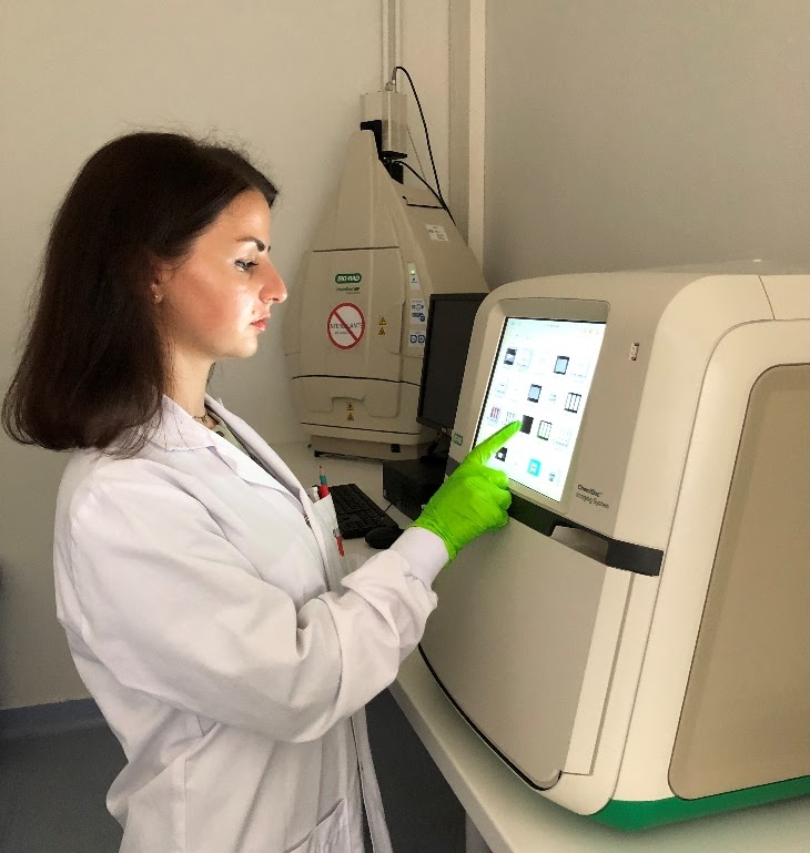 Доц. Соломія Крамар проводить детекцію білків на мембрані при виконанні Western Blot (2024 рік)