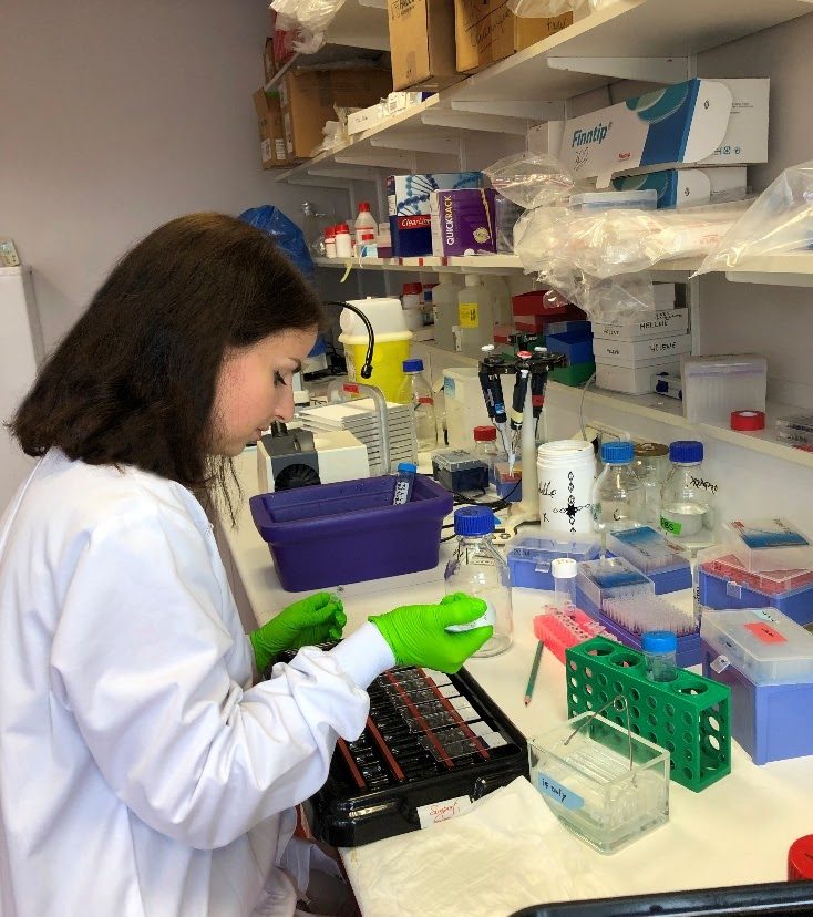 Доц. Соломія Крамар під час виконання імунофлуоресцентних забарвлень (2024 рік)