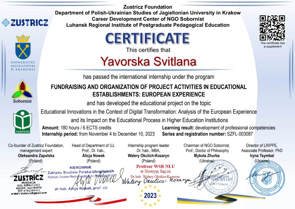 Доцент Яворська С.І. пройшли онлайн міжнародне стажування 04.11.-10.12.2024 р. в м. Кракові (Республіка Польща) на тему: «Освітні нововведення в контексті цифрової трансформації: Аналіз європейського досвіду та вплив на її розвиток у вищих навчальних закладах.» (180 год)