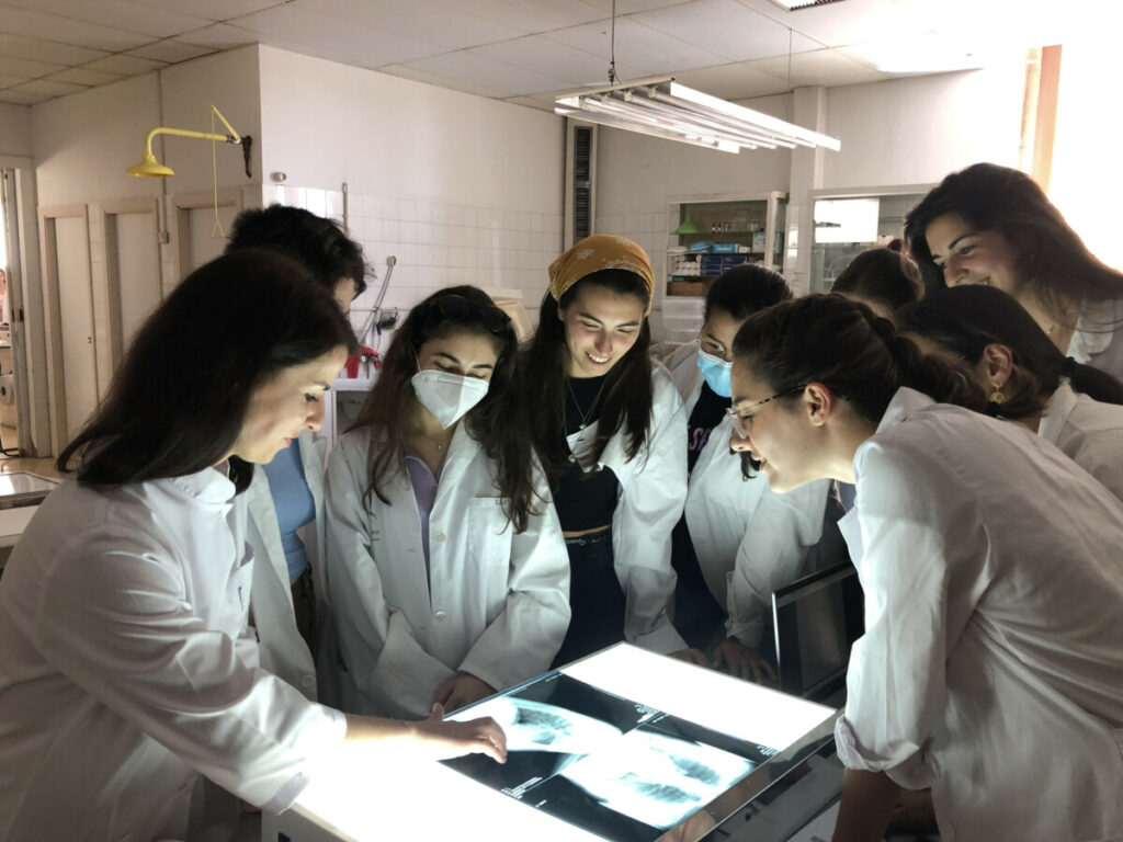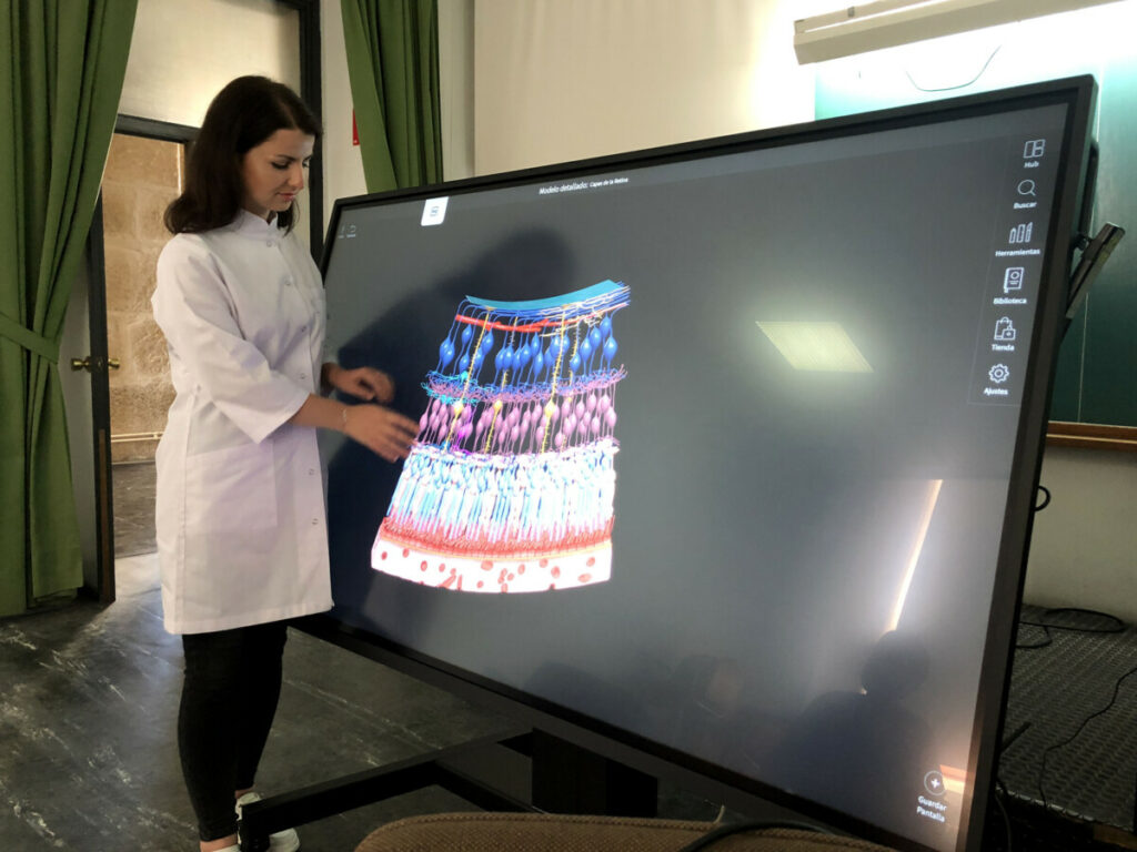 Доц. Соломія Крамар під час практичного заняття із здобувачами кафедри морфологічних наук медичного факультету Університету Сантьяго де Компостера (2022 рік)