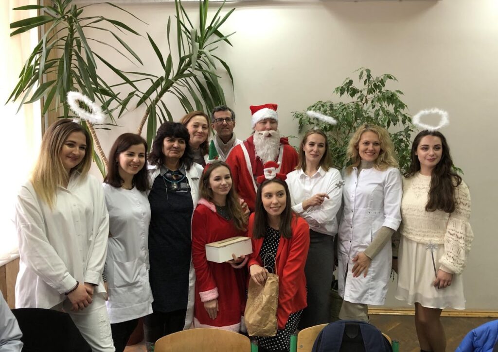 Доценти кафедри гістології та ембріології Крамар С.Б., Андріїшин О.П., Довгалюк А.І. Довбуш А.В. та студенти-волонтери під час святкування дня святого Миколая. День благодійності, добра та посмішок (2020 рік)