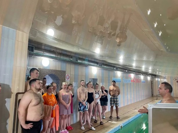 Далі наближення до потопельника в активному утопленні, комунікація. За легендою, потопельник охоплює за тулуб рятувальника, створює додаткову загрозу для його життя. Студентів навчили, як звільнитися від такого захоплення і перемістити потопельника до краю басейну або в положенні на спині або на животі.