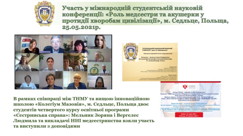 Участь у міжнародній студентській науковій конференції: «Роль медсестри та акушерки у протидії хворобам цивілізації», м. Седльце, Польща.28.05.202118.03.2024