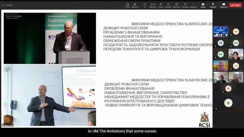 З ірландським досвідом учасників ознайомив Марк Вайт (Mark White), почесний гість конференції, декан факультету медсестринства та акушерства Королівського коледжу хірургів в Ірландії (https://www.rcsi.com/dublin/about/faculty-of-nursing-and-midwifery), який розповів про ключові сили, що формують сучасне медсестринство та акушерство, зосереджуючи увагу на стратегічному плануванні та розвитку лідерства в цій галузі.