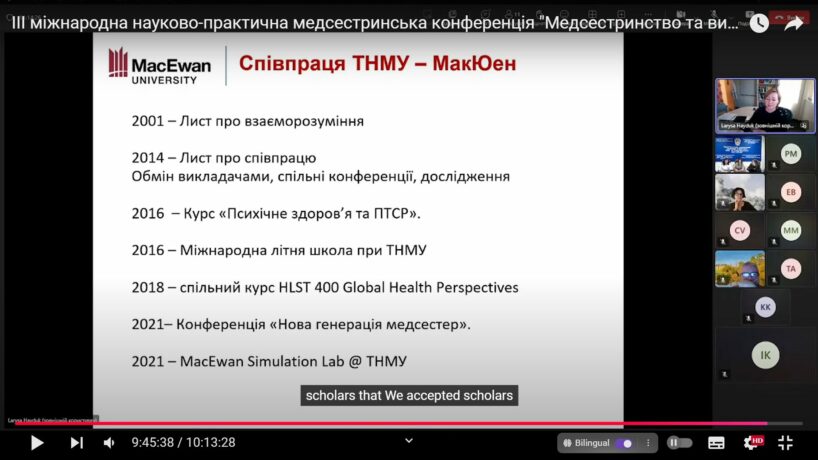На конференції виступила Лариса Гайдук, директор Українського центру ресурсів та розвитку (Ukrainian Resource and Development Centre (https://www.macewan.ca/academics/centres-institutes/ukrainian-resource-and-development-centre/ ) з Університету МакЮена. У своїй доповіді Лариса Гайдук представила тему «Трансгранична співпраця: партнерство MacEwan-TNMU у медсестринстві», в якій висвітлила основні досягнення та перспективи співпраці між Університетом МакЮена та Тернопільським національним медичним університетом імені І.Горбачевського.