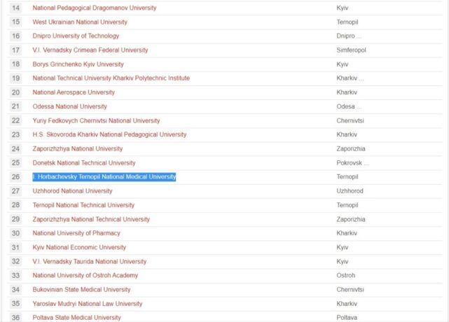 Нещодавно рейтинг університетів UniRank (University Ranking – https://www.4icu.org/ua/) оприлюднив результати за 2023 рік. До переліку університетів України увійшов 181 виш нашої держави. Тернопільський національний медичний університет імені І.Горбачевського посів першу позицію серед медичних закладів вищої освіти і двадцять шосту позицію у загальному підсумку. Це є високий показник діяльності, адже ТНМУ гідно лідирує серед багатопрофільних університетів, які мають багатотисячні науково-педагогічні колективи і понад кілька десятків тисяч студентської спільноти.