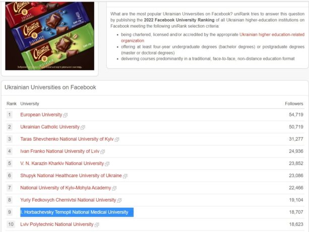 Під час визначення рейтингу також враховують представлення вишу у соціальних мережах. Серед офіційних сторінок 150 закладів вищої освіти у Фейсбуці ТНМУ (https://www.facebook.com/tdmu.official/) займає 9 місце. До уваги бралися показники за 2022 рік, коли за сторінкою стежило 18707 осіб, а сьогодні це вже 19689 осіб. Сьогодні органічне охоплення сторінки ТНМУ у Фейсбуці становить понад 640 тисяч осіб.