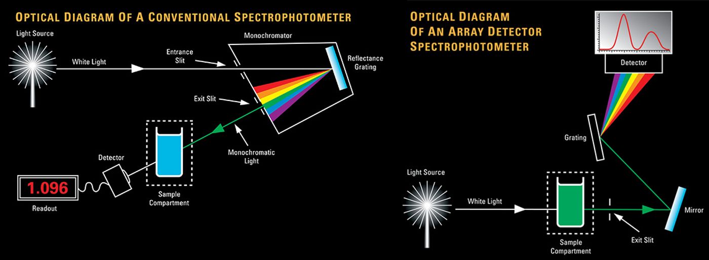 UV-Vis spectroscopy measures the absorption of light to quickly reveal properties of liquids. Typically, a spectrophotometer has a light source directing light through a sample and a detector evaluating the intensity and nature of the light it receives. Conventional designs feature optics that pass a single monochromatic wavelength through a sample and a photodiode detector. Advanced instruments pass a polychromic white light through a sample and feature dispersive optics and an array detector to collect a full absorbance spectrum.