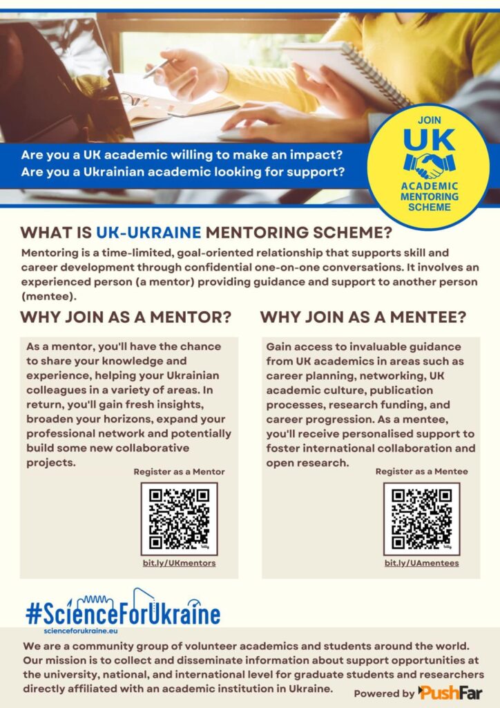 Join the UK-Ukraine Academic Mentoring Scheme to accelerate the career development of Ukrainian-affiliated academics! Register as a UK mentor: https://www.pushfar.com/mentor-registration/6Aj4rMK5y8 as a Ukrainian mentee: https://www.pushfar.com/mentee-registration/6Aj4rMK5y8