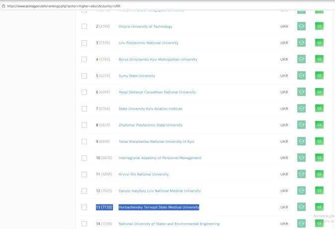 У новій редакції світового рейтингу академічних і науково-дослідних установ SCImago Institutions Rankings (SIR) у 2026 році Тернопільський національний медичний університет посів друге місце серед медичних закладів вищої освіти України і тринадцяте у загальному списку українських вишів (https://www.scimagoir.com/rankings.php?sector=Higher+educ.&country=UKR).